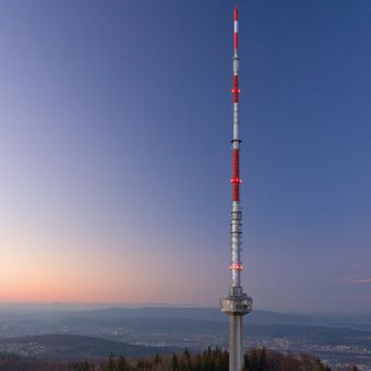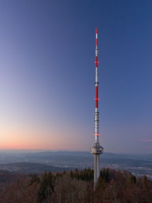 Der Betonsendeturm erhebt sich 186.7 Meter über den Uetliberg und dient als Hauptsendestation für den Großraum Zürich.