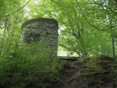 Die Burgruine steht auf einem bewaldeten Hügel mit drei handgehauenen Terrassen und erhaltenen Innenmauern der ursprünglichen Struktur.