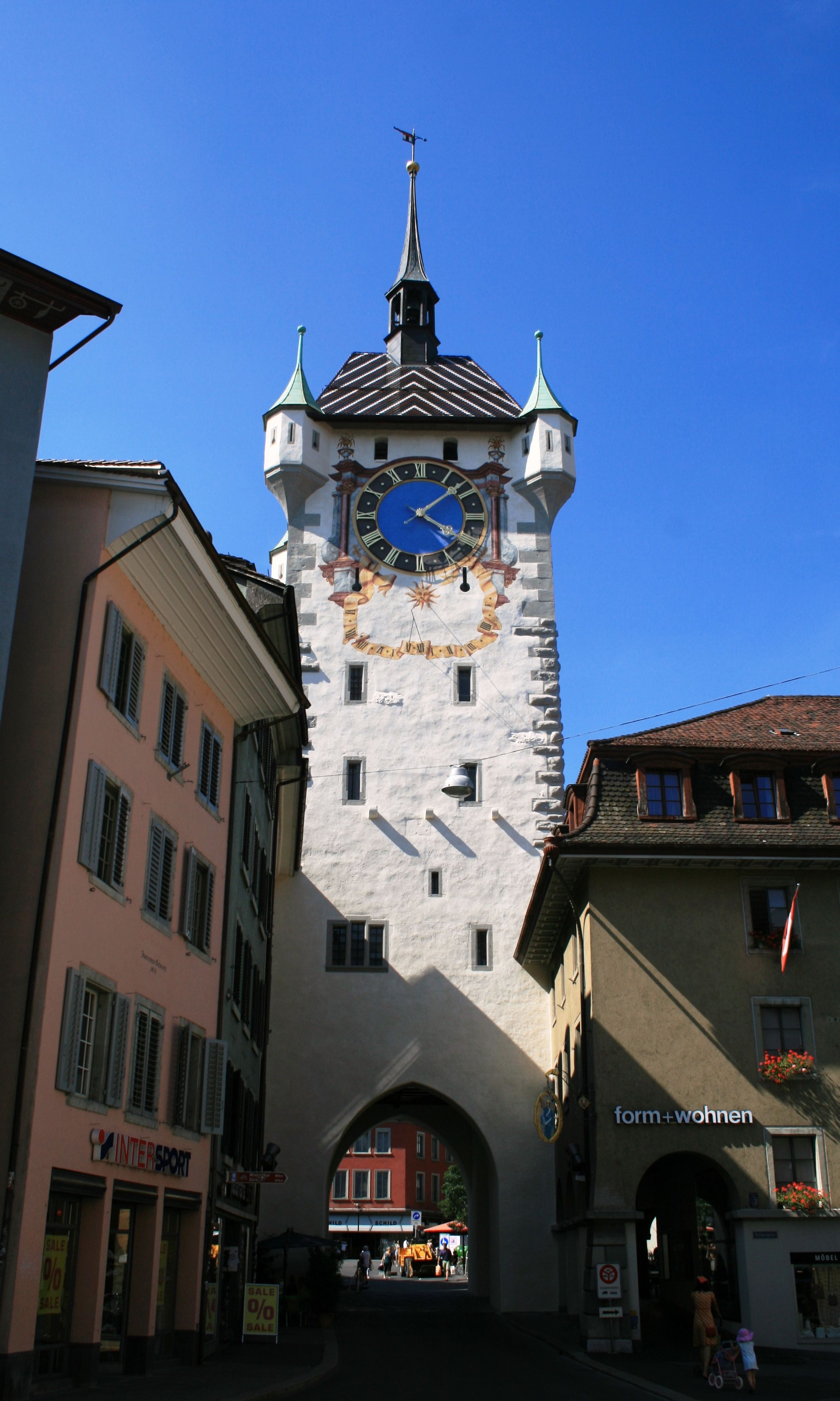 Stadtturm Baden, Mittelalterliches Stadttor und Wehrturm in Baden, Schweiz.