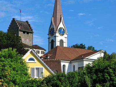 Die Reformierte Kirche Uster verfügt über Steinmauern, große Fenster und einen hohen Turm, der über die Gebäude des Stadtzentrums hinausragt.