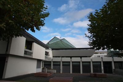 Die Sankt Andreas Kirche zeigt eine Betonkonstruktion mit klaren Linien, geometrischen Formen und großen Fenstern für natürliches Licht.