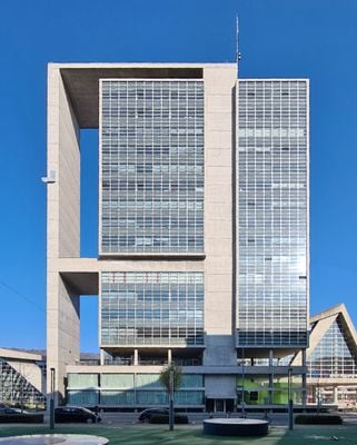 Das Kongresshaus vereint einen Büroturm, Konzertsaal und Hallenbad in einer Betonkonstruktion mit geometrischen Formen.