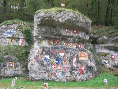 Wappenfelsanlage Chessiloch, Felsformation mit Militärgemälden in Grellingen, Schweiz