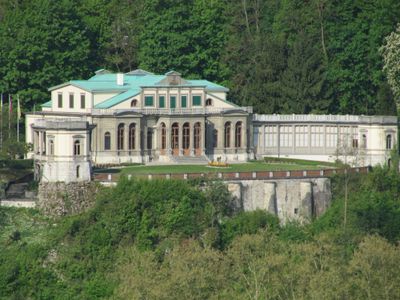 Villa Charlottenfels steht auf einer Felsformation über dem Rhein, mit orientalischen Architekturelementen und dekorierten Innenräumen.