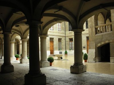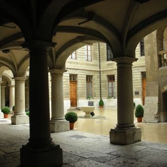 Das Hôtel de Ville zeigt drei Ebenen neoklassischer Architektur mit einem zentralen Innenhof und Steinfassaden im Herzen Genfs.