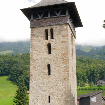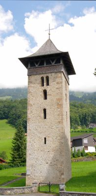 Alter Kirchturm, Dorfeingang, Kirchturm in Lungern im Kanton Obwalden, Schweiz