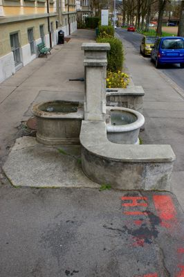 Doppelbrunnen Studerstrasse, Trinkbrunnen vor dem Schulhaus Enge-Felsenau an der Studerstrasse in der Stadt Bern, Schweiz