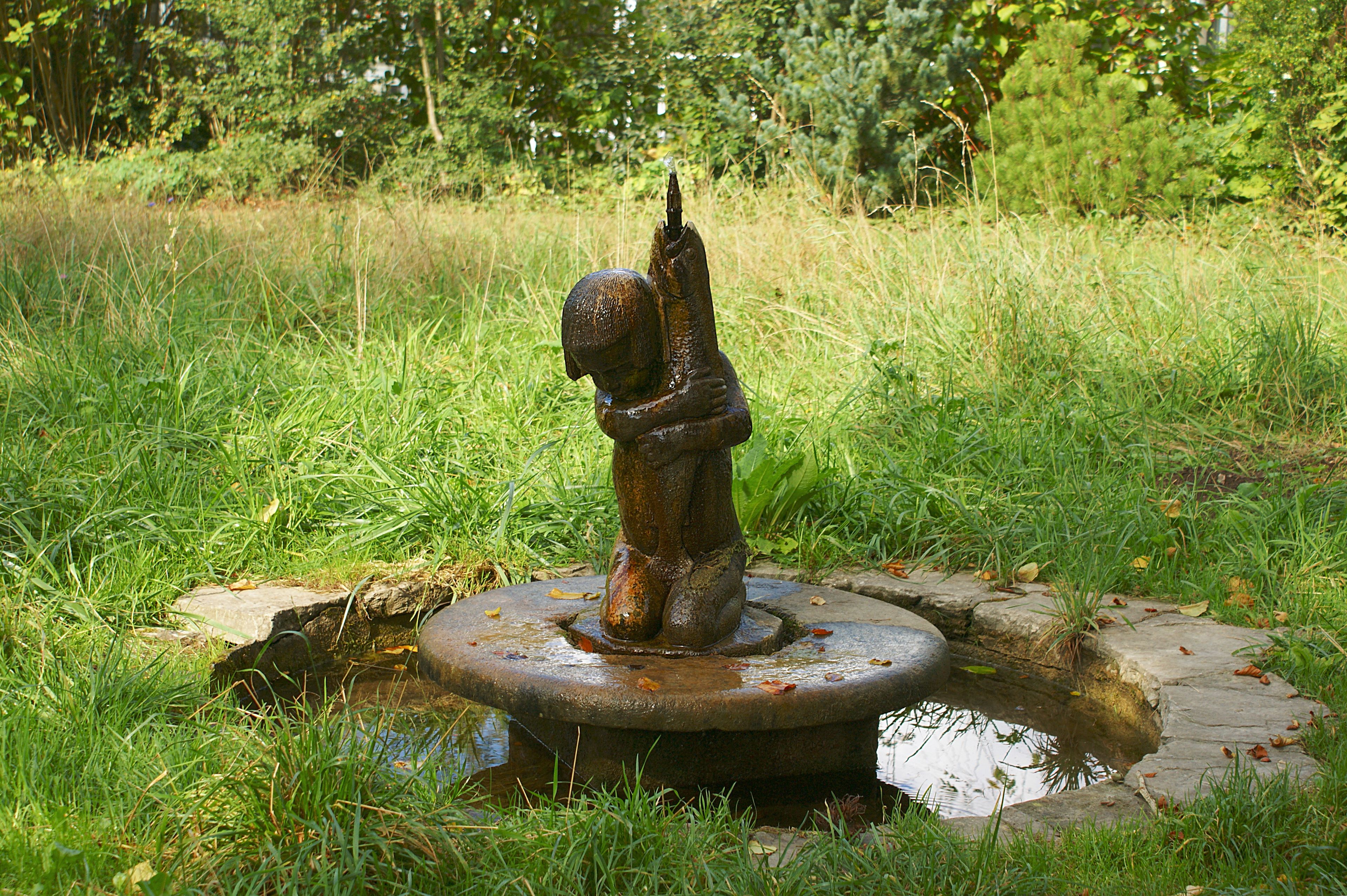 Fischfänger / Zierteich, Zierteich mit Skulptur in der Stadt Bern, Schweiz