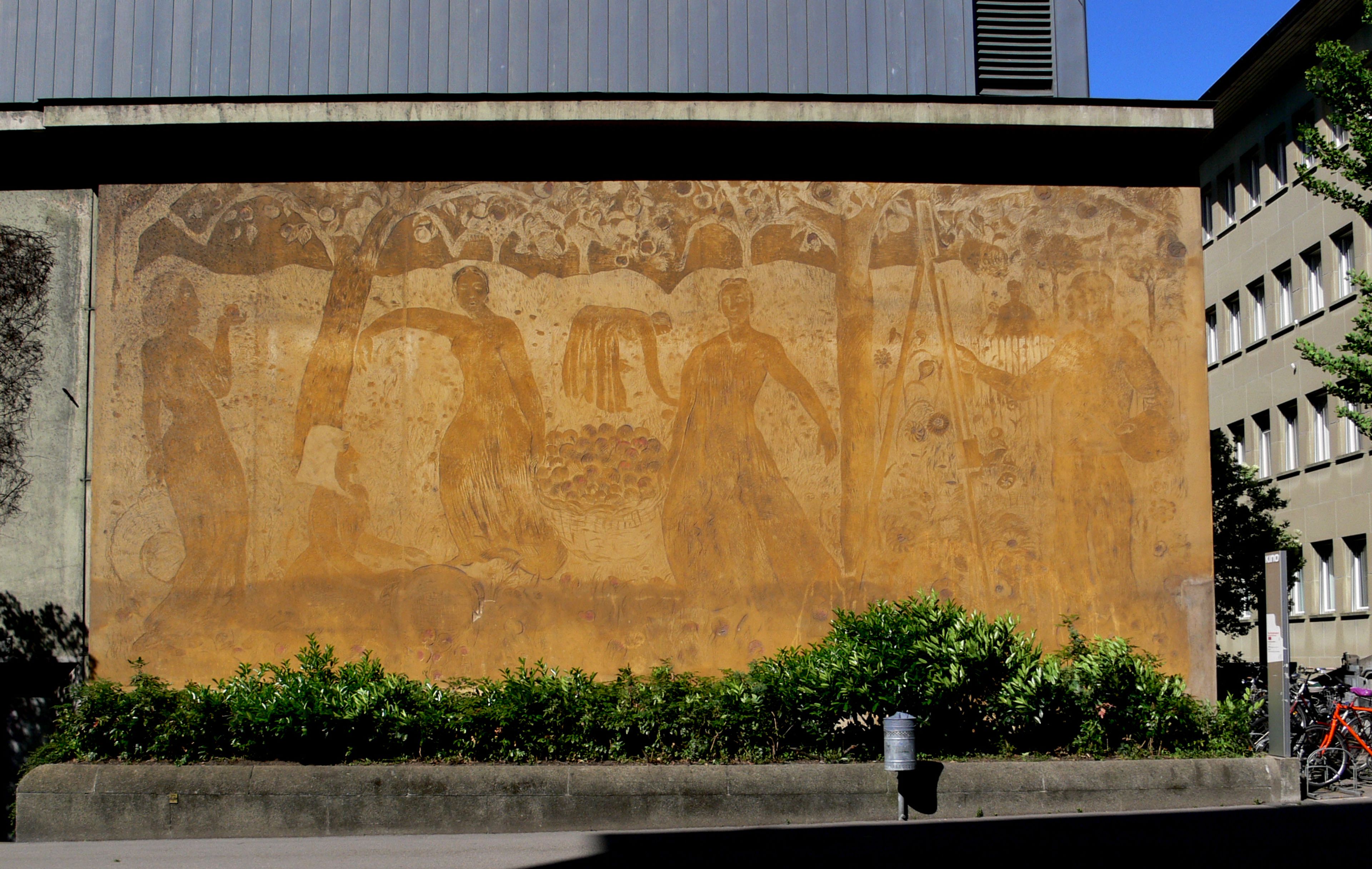 Obsternte, Grossformatiges Sgraffito an der Aussenwand des Kunstmuseums in der Stadt Bern, Schweiz