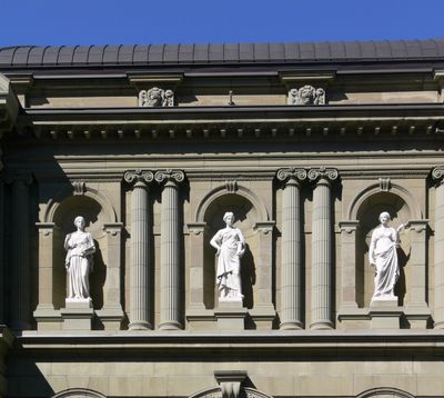 Allegorien der Schönen Künste, Ensemble aus drei Statuen über dem Haupteingang des Kunstmuseums Bern in der Stadt Bern, Schweiz