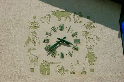 Tierkreiszeichen, Sgraffito Wanduhr am Wylergutschulhaus in der Stadt Bern, Schweiz