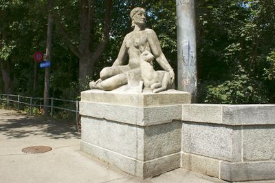 Weibliche Figur mit Reh, Skulptur von Paul Kunz am Südende der Lorrainebrücke in der Stadt Bern, Schweiz