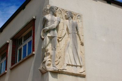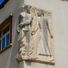 Florian und sein Engel, Kalksteinskulptur an Gebäudewand in der Stadt Bern, Schweiz
