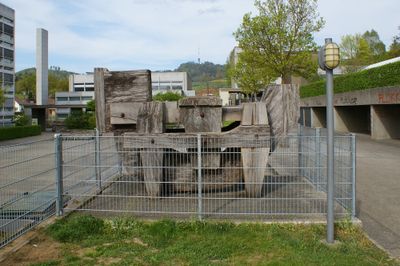 Pferd, Holzplastik auf dem Areal des Schulhauses Rüti in Ostermundigen, Schweiz