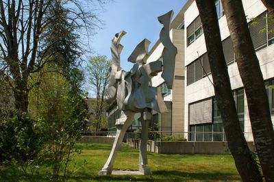 Diskutierender, Grossformatige Aluminiumblechplastik vor dem Haus der Schweizerischen Krebsliga in der Stadt Bern, Schweiz