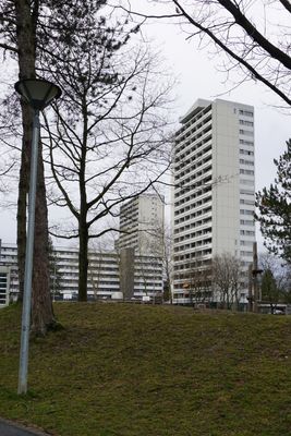 Wohnhochhäuser Tscharnergut, Wohnhochhäuser und Teil der Siedlung Tscharnergut in der Stadt Bern, Schweiz