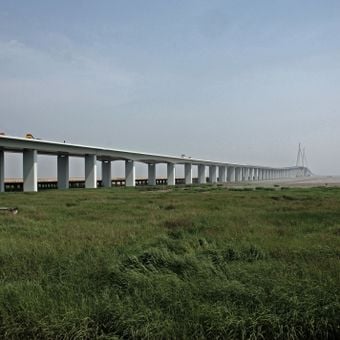 Die Hangzhou-Bucht-Brücke ist eine Schrägseilbrücke, die sich über etwa fünfunddreißig Komma sieben Kilometer durch die Hangzhou-Bucht erstreckt und Jiaxing mit Ningbo in der Provinz Zhejiang verbindet.