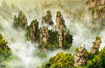 Der Zhangjiajie-Nationalwaldpark ist ein geschütztes Waldgebiet im zentralen China mit Tausenden von steilen Sandsteinsäulen, die sich aus dichtem subtropischem Wald erheben. Die Landschaft wirkt wie eine andere Welt, mit Felssäulen, die bis zu über 1.000 Meter hoch sind und an vielen Stellen durch Nebel verhüllt werden.