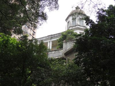 Das Gebäude steht zwischen modernen Hochhäusern, sein großer Garten und architektonische Elemente sind vom erhöhten Bowen Road-Weg sichtbar.