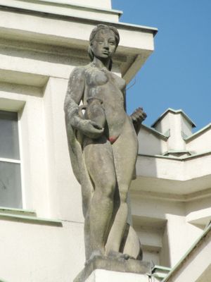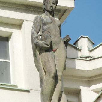 Sochy alegorií Nežárky a Lužnice na průčelí Podolské vodárny, statue in Podolí, Czech Republic