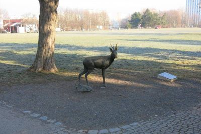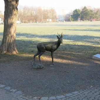 Replika sochy srny s mládětem v parku Na Pankráci, statue in Nusle, Czech Republic