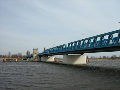 Der Mechanismus der Brücke ermöglicht das Anheben des mittleren Abschnitts, wodurch Schiffe auf der Peene passieren können.