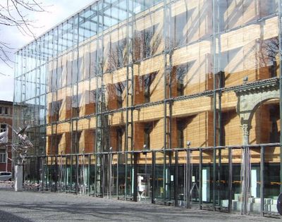 Das Gebäude selbst ist bemerkenswert wegen seiner modernen Architektur mit einer transparenten Glashülle, die das ursprüngliche historische Bauwerk umgibt. Diese besondere Konstruktion wird oft als Haus in einer Vitrine beschrieben und schafft einen eigenartigen Kontrast zwischen Alt und Neu.