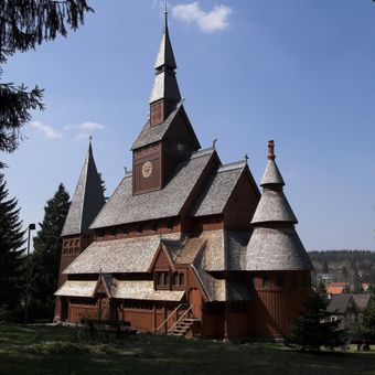 Der Bau begann 1907 unter Architekt Karl Mohrmann, der die mittelalterliche Stabkirche Borgund aus Norwegen auf deutschem Boden nachbildete.