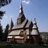 Die Gustav-Adolf-Stabkirche zeigt mehrere Ebenen von Satteldächern, Drachenkopfverzierungen und vertikale Holzplanken an den Außenwänden.
