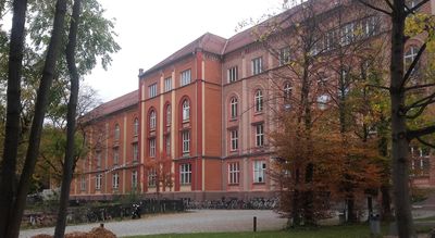 Das Altes Hauptkrankenhaus ist ein dreistöckiges Gebäude in Augsburg mit Backsteinfassaden, großen Fenstern und symmetrischer Architektur aus der Maximilianzeit. Die Struktur zeigt die klassischen Merkmale eines 19. Jahrhundert-Hospitals mit gut organisierten Räumen für Patienten und medizinisches Personal.