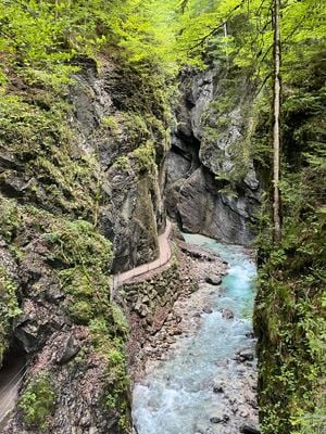 Durch diese schmale Schlucht zu gehen fühlt sich an, als würde man eine verborgene Welt betreten, in der hohe Felswände über dem tosenden Fluss Partnach aufragen. Der Weg ist in den Fels gehauen und das Geräusch des fließenden Wassers erfüllt die Luft, was eine ruhige aber kraftvolle Atmosphäre schafft, die dazu einlädt, langsamer zu werden und jedes Detail genau zu betrachten.
