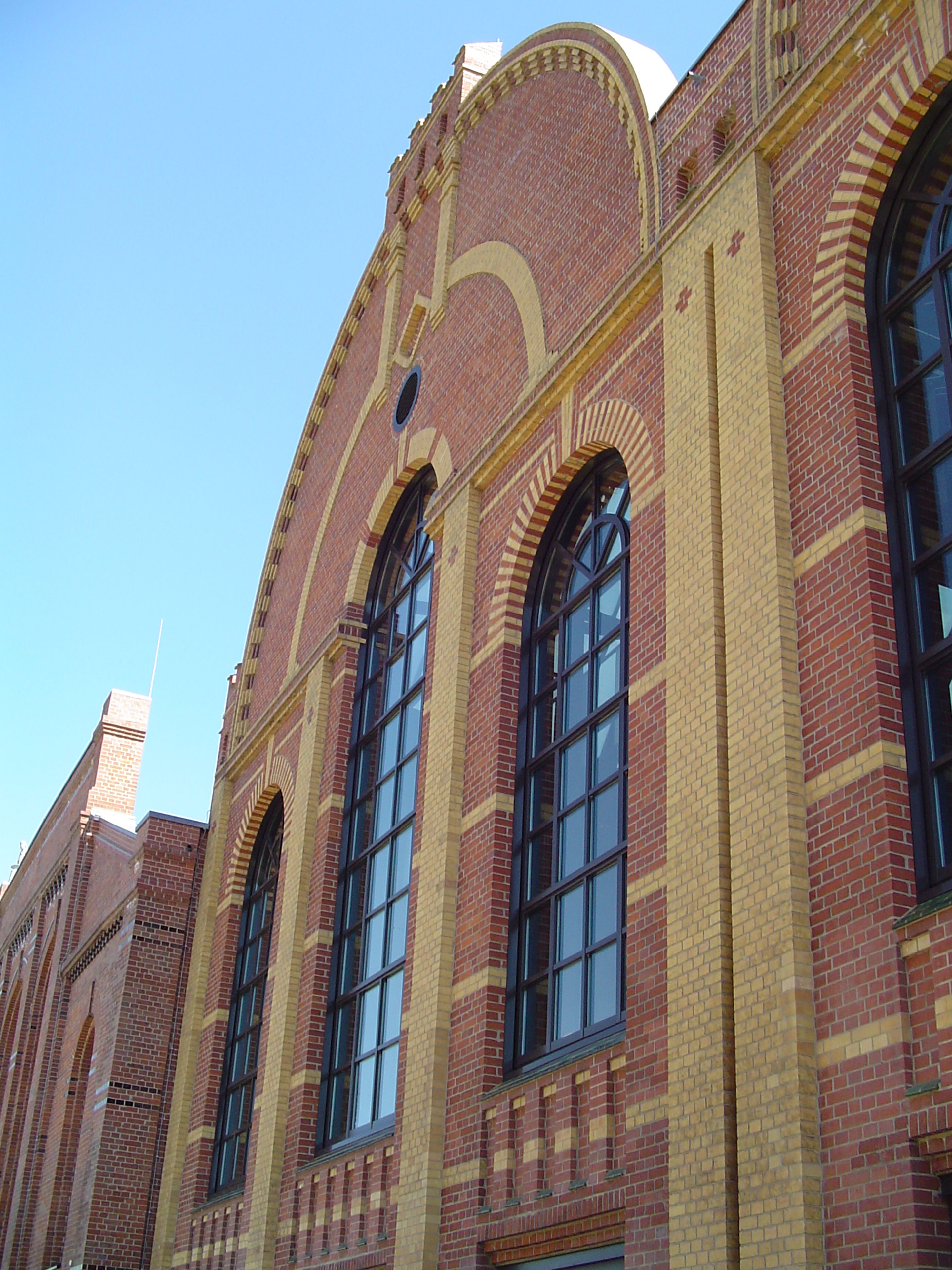 Fabrik mit straßenparallelem viergeschossigem Produktionsgebäude in gelbem Ziegelverblender (1909), rückwärtigem viergeschossigem Produktionsgebäude in Backstein (1910, Geyer-Bau), viergeschossigem Produktionsgebäude mit Schieferverkleidung (19