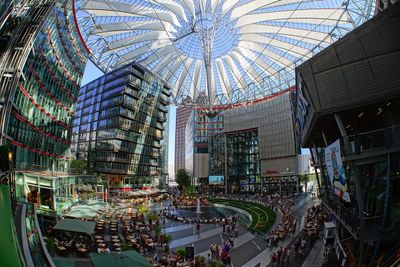 Das Sony Center zeigt eine markante Glas- und Stahldachkonstruktion, die sich über mehrere kreisförmig angeordnete Gebäude am Potsdamer Platz erstreckt.