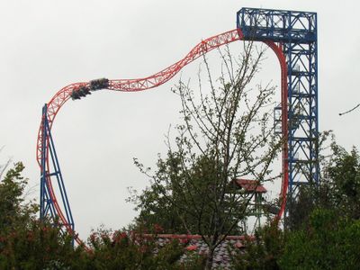 Fahrer erreichen Geschwindigkeiten von bis zu 105 Kilometern pro Stunde wahrend sie in X-formigen Sitzen sitzen, was ein freies Gefuhl vermittelt. Diese seitliche Anordnung ermoglicht ein intensiveres Gefuhl der Bewegung uber jedem der beiden Uberschlage.
