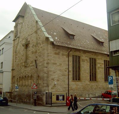Die Auferstehungskirche steht in Stuttgart mit ihren Steinmauern, dem Giebeldach und großen Fenstern, die den Gottesdienstraum erhellen.