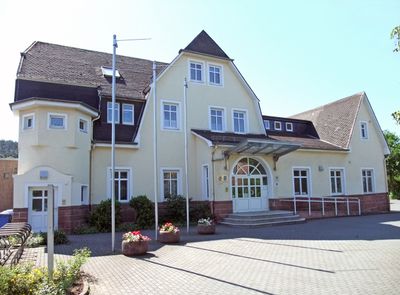 Das L-förmige Hauptgebäude, heute als Gemeindeverwaltung genutzt, zeigt neubarocke Merkmale durch seine ornamentale Putzfassade und symmetrische Komposition.