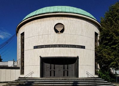 Die Neue Synagoge in Golzheim ist ein modernes Bauwerk mit großen senkrechten Fenstern, das 1958 von Architekt Hermann Zvi Guttmann entworfen wurde. Das Gebäude an der Zietenstraße 50 bietet Platz für etwa 400 Besucher und prägt mit seiner zeitgenössischen Architektur das Straßenbild.
