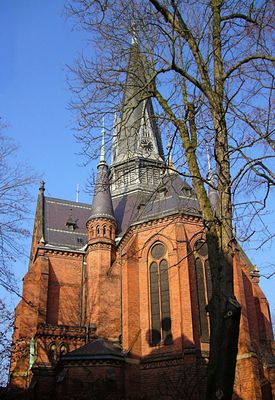 Die Bergkirche ist ein Kirchengebäude im neugotischen Stil mit einem markanten Turm und Schieferdach, erbaut aus rotem Klinker und grauem Sandstein aus der Pfalz. Das Innere folgt einem breiten, offenen Grundriss, der ohne Säulen oder Hindernisse auskommt.