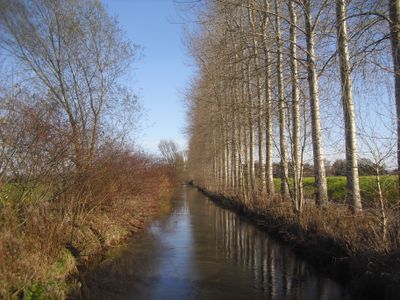 Der Boker-Heide-Kanal erstreckt sich über 32 Kilometer von Paderborn nach Lippstadt, mit linearen Pappelpflanzungen entlang seiner Ufer.