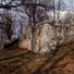 Die Steinüberreste der Burg Hahnenkamm stehen auf 606 Metern über dem Meeresspiegel, mit Abschnitten rekonstruierter Umfassungsmauern und Fundamentstrukturen.