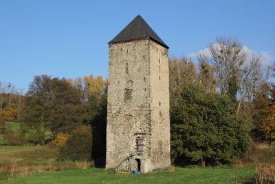 Burg Mühlenbach ist eine mittelalterliche Burgruine in Koblenz, deren Hauptturm aus Grauwacke errichtet wurde und noch heute über mehrere Stockwerke hinweg erhalten ist. Der Turm verfügt über charakteristische Schlitzfenster und trägt ein zeltzeltdachförmiges Dach, das seine ursprüngliche Konstruktion widerspiegelt.