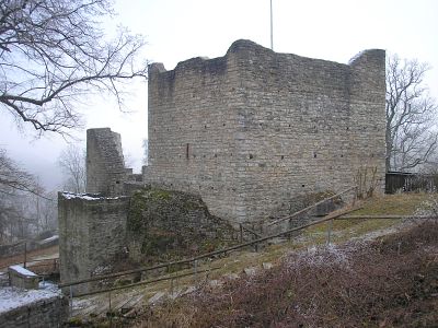Die Steinbefestigung steht auf einem felsigen Hügel und zeigt Mauern und einen Turm, die die mittelalterliche deutsche Verteidigungsarchitektur demonstrieren.