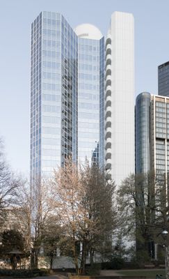 Das Bürohaus an der Alten Oper ist ein 20-geschossiges Hochhaus in Frankfurts Finanzdistrikt, das sich an der Ecke Neue Mainzer Straße und Junghofstraße erhebt. Die Fassade aus Glas und Metall prägt das urbane Erscheinungsbild mit klaren, modernen Linien.