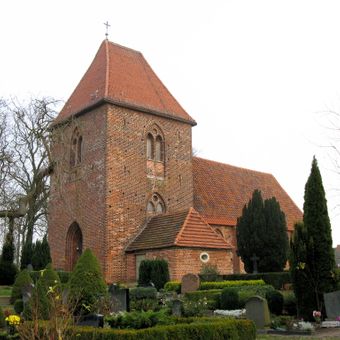 Die Kirche in Groß Brütz zeigt Backsteingotik mit hohen Spitzbögen und einem dreiseitigen östlichen Abschluss, typisch für norddeutsche Baukunst.