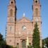 Die dreischiffige gewölbte Basilika zeigt eine Doppelturmfassade aus farbigem Sandstein mit Statuen der vier Evangelisten über dem Hauptportal.