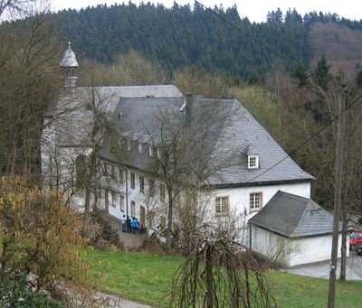 Das Kloster Brunnen steht in den bewaldeten Hügeln Nordrhein-Westfalens und zeigt barocke Architektur mit hellen Steinmauern und Satteldächern.