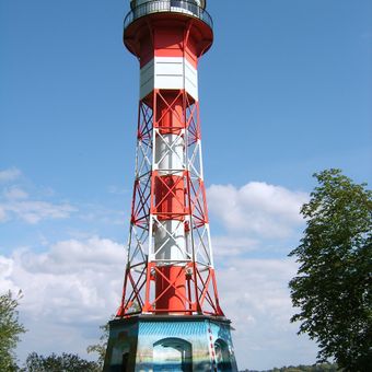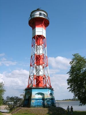 Der Stahlgitterturm steht 29.95 Meter hoch auf einem sechseckigen Ziegelsockel am Ufer der Elbe im Hamburger Stadtteil Altona.