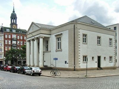 Das klassizistische Gebäude weist eine symmetrische Architektur mit markanten Säulen auf und befindet sich an der Kreuzung zum Zeughausmarkt im Bezirk Hamburg-Mitte.
