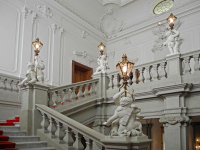 Die Treppe zeigt Statuen der vier Kontinente und trägt damit eine weltumspannende Symbolik, die die Bedeutung des Hofes widerspiegelt. Diese Darstellungen erzählen von den Handelsbeziehungen und dem Machtanspruch der sächsischen Herrscher.