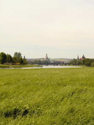 Der Name Elbwiesen verweist auf die Funktion als Wiesenlandschaft entlang des Flusses. Schafe grasen hier, besonders während Filmfestivale, und prägen das Bild der Landschaft vor der historischen Silhouette der Dresdener Altstadt.